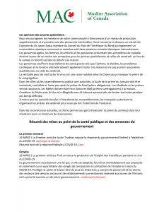 Tous les masajids et les centres, à l'exception du Centre Islamique du MAC d'Ottawa, sont ouverts et continuent d'offrir les prières quotidiennes en suivant les règles de restriction des rassemblements à moins de 250 personnes tout en maintenant des restrictions et des mesures supplémentaires de sécurité et de propreté. Tous les autres événements et programmes des masajids et des centres sont annulés.